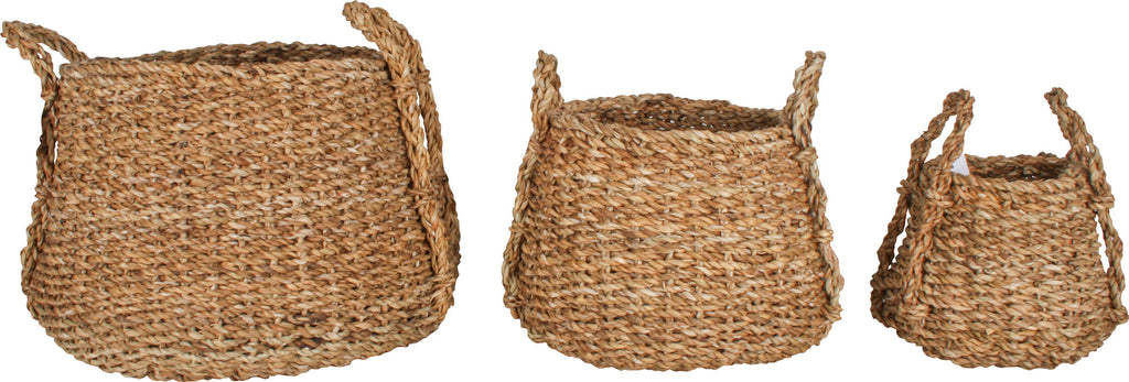 This Set of 3 Seagrass Dim Jhuri Design serves a practical purpose in nearly every room of the home, providing a convenient spot to store those miscellaneous items that often clutter the countertops and floors. Move your things around easily and attractive design instantly fit into any decor of your house. Ideal for a bedroom, laundry room, kitchen or any spot in your house. FEATURES AND SPECIFICATIONS: Set of 3 Dimensions: Small: 16cm x 21cm x 20cm Medium: 24cm x 31cm x 25cm Large: 34cm x 45cm x 30cm Material: Natural Seagrass Colour: Natural Wood Lightweight and Durable Add instant warmth and natural texture whenever you place it Can be used as a plant container, picnic basket, groceries basket, toys storage, decorative piece, laundry basket stackable and more! Making your home beautiful and organised