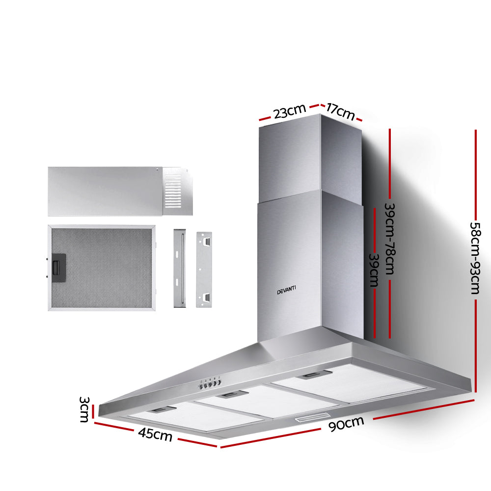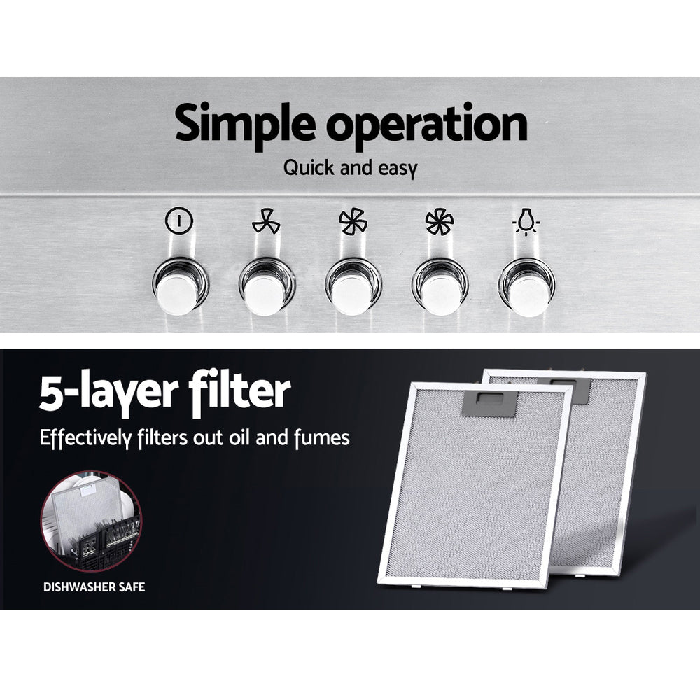 Say goodbye to smoky fumes and unwelcome cooking odours with our Devanti Range Hood. With its high-performance motors, the brushed stainless steel range hood provides a steady upflow and filtered extraction of fumes and oil to keep your cooktop area clean and fresh after every use. With its 3-speed rocker button switches, the extraction speed can be adjusted to suit the circumstances. Other features include three non-stick 5-layer aluminium filters that are removable and replaceable and bright LED lighting to facilitate your illuminated cooking. The range hood is wall mounted and the chimney can be adjusted to fit the installation space.